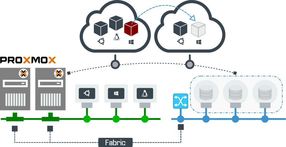 • NAS & SAN.  Es muy fácil el uso de NAS o SAN ya sea a través de Fibra Canal, iSCSI Over Ethernet o NFS. Proxmox no le limita.